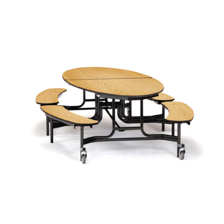 The National Public Seating METB NPS® Mobile Cafeteria Table with Benches is a meticulously engineered piece of furniture designed to meet the diverse needs of various segment markets within the cafeteria and educational furniture industry. Measuring 45 inches in width, 121 inches in depth, and 29 inches in height, this table is tailored to maximize seating capacity and space efficiency. The elliptical shape offers a modern aesthetic appeal while ensuring functionality in high-traffic areas. Constructed from robust 14-gauge steel, it guarantees long-lasting durability and stability, crucial for environments requiring frequent use. The high-pressure laminate top provides a resilient surface that resists scratches and stains, making it ideal for maintaining a clean and professional appearance. Furthermore, the METB table is MAS2 and UL Certified, assuring compliance with industry standards for safety and quality. An additional feature is its potential to be adapted for ADA compatibility, enhancing accessibility for all users. This table is a versatile choice for schools, corporate cafeterias, and public dining areas, offering reliable performance and a commitment to inclusivity and sustainability in design.