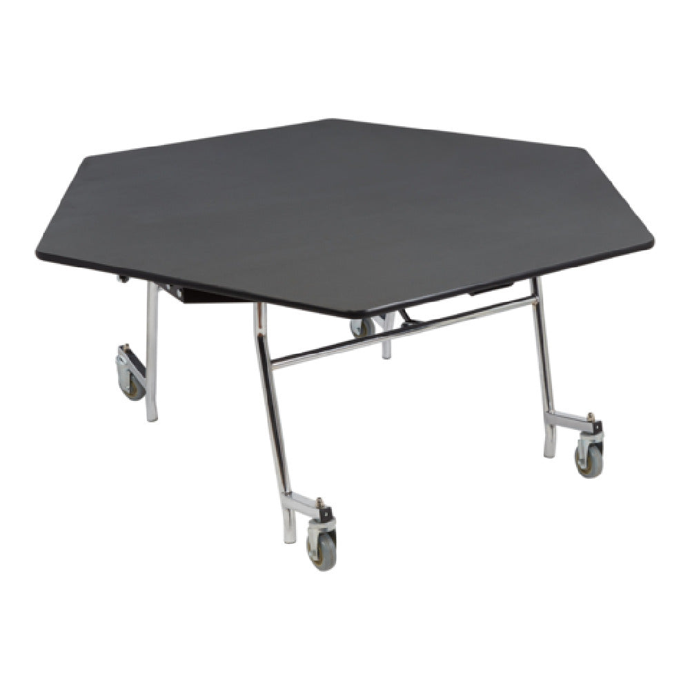 The National Public Seating MTSSF-60H NPS® Mobile EasyFold Cafeteria Table is a versatile piece of furniture designed to meet the demands of various educational and institutional settings. With dimensions of 60 inches in width, 60 inches in depth, and 29 inches in height, this hexagonal table provides ample space for seating and interaction. Built with 14-gauge steel construction, it ensures durability and stability, making it ideal for high-traffic environments. The high-pressure laminate top offers a smooth and resilient surface, easy to clean and maintain, accommodating the bustling activity of cafeteria settings. Certified with MAS2 and UL, this table meets stringent safety and performance standards, providing assurance of quality and reliability. Its mobility feature allows for easy rearrangement and storage, enhancing the flexibility of space utilization. Additionally, it can be made ADA compatible, ensuring accessibility for all users. This table caters to diverse market segments, from schools and universities to corporate dining areas, where adaptability, durability, and compliance with accessibility standards are of paramount importance. The National Public Seating MTSSF-60H embodies functionality and practicality, making it a valuable asset in any environment requiring robust and flexible seating solutions.