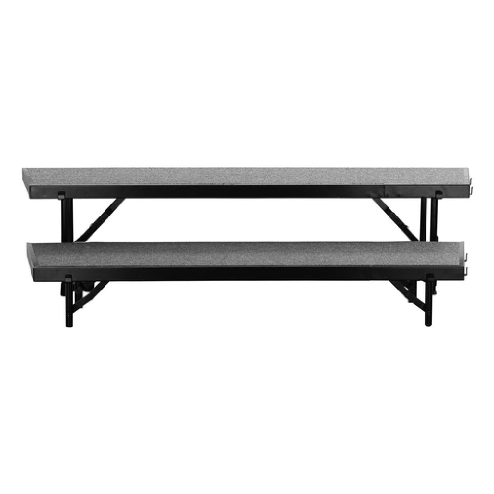 The National Public Seating RT2L NPS® Tapered Standing Choral Riser 18"W X 36"D X 16"H is a versatile and robust solution for choral performances and events. This riser features two levels, accommodating multiple performers comfortably. Its 18-inch width and 36-inch depth provide ample space for each participant, while the 16-inch height ensures visibility and engagement. Engineered to support over 200 pounds per square foot, it delivers exceptional load capacity, making it suitable for a wide range of settings from school choirs to professional music venues. The 3/4-inch plywood deck offers durability and stability, reinforced by a 16-gauge 1-13/16-inch steel channel black frame that adds strength and longevity. The folding legs and drop-in couplings ease transportation and assembly, allowing for quick setup and teardown. Certified by ANSI/BIFMA and recognized with MAS Green Certification, this riser meets rigorous industry standards for safety, quality, and environmental responsibility. Its thoughtful design and engineering make the National Public Seating RT2L NPS® Tapered Standing Choral Riser an essential asset for music educators, event organizers, and performance venues seeking reliable and sustainable choral riser solutions.