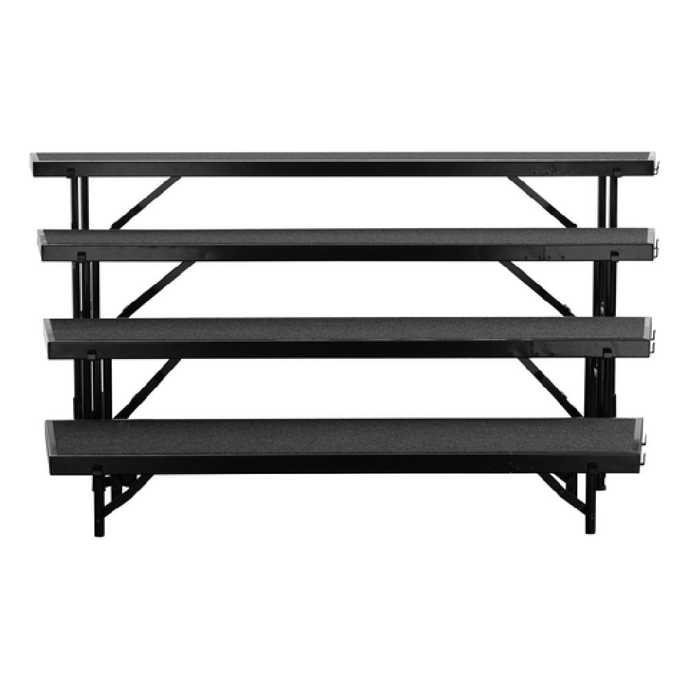 The National Public Seating RT4L NPS® Tapered Standing Choral Riser is a meticulously engineered solution designed to elevate choral performances across various venues. Measuring at 18 inches in width, 72 inches in depth, and 32 inches in height, this riser is structured with four levels to accommodate performers efficiently. It boasts a remarkable load capacity exceeding 200 pounds per square foot, ensuring stability and safety for large groups. The riser is constructed with a 3/4-inch thick plywood deck that provides a reliable and durable surface for performers. Its reinforced black frame is made of 16-gauge, 1-13/16-inch steel channels, offering exceptional strength and longevity. For ease of setup and storage, the riser features folding legs with drop-in couplings, making it versatile for both permanent and temporary installations. Certified by ANSI/BIFMA and MAS Green, this riser meets industry standards for safety and environmental responsibility. The RT4L is specifically designed for schools, churches, and performance halls that require a dependable and professional-grade choral riser. Its combination of robust construction, ease of use, and certified quality makes it a standout choice for institutions seeking to enhance their choir's performance space with a durable and reliable product.