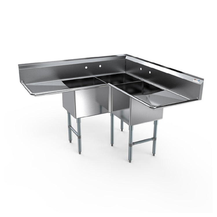 The NBR Equipment 3CSG-181814LR24 Economy Corner Sink Three-compartment 62-15/16"W x 43-3/4"H is a versatile fixture engineered to cater to the demands of commercial kitchens. This sink boasts a trio of 18"W x 18" front-to-back x 14" deep compartments, providing ample space for washing, rinsing, and sanitizing tasks. Complementing these compartments are dual 24" drainboards on the left and right sides, offering convenient areas for drying and organizing kitchenware. The sink's 9"H backsplash is designed to protect walls from water damage, while the inclusion of two sets of splash mount faucet holes with 8" centers ensures adaptability for various faucet configurations. Constructed from 18/300 series stainless steel, known for its durability and resistance to corrosion, this sink is built to withstand heavy use. The 3-1/2" die-stamped drain openings facilitate efficient water drainage. Additionally, its 3/4" radius coved corners enhance safety and ease cleaning. Galvanized legs, gussets, and bracing provide robust support, further complemented by adjustable plastic bullet feet for stability on uneven surfaces. NSF certification validates its adherence to rigorous health and safety standards, making this sink a practical and reliable choice for food service operations seeking quality and efficiency.