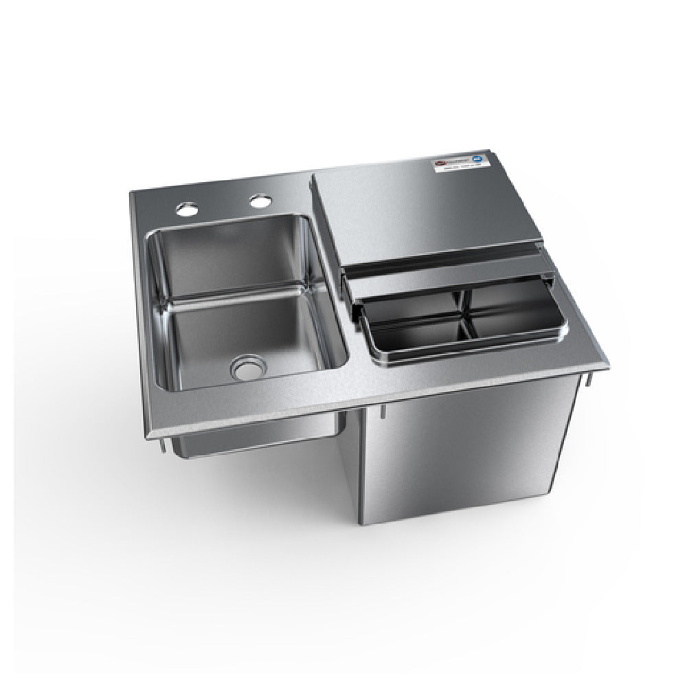 The NBR Equipment DIB-2-2118 Ice & Water Unit is a versatile drop-in unit with dimensions of 21 inches wide by 18 inches deep, catering to diverse industry needs. This unit features an 11-inch deep insulated ice bin, offering efficient ice storage capabilities, essential for food service operations that require consistent ice availability. The removable sliding cover enhances usability and sanitation, making access convenient while maintaining hygiene standards. Additionally, the removable water sink grate facilitates easy cleaning, ensuring the unit remains in optimal condition. This unit includes a drain, providing an efficient solution for water management within busy kitchen environments. Constructed with a robust 14/304 stainless steel deck and an 18/304 stainless steel body and cover, it promises durability and longevity, vital for high-demand settings. The recommended cutout size of 20-1/4 inches by 17-1/4 inches ensures a seamless installation process. Certified by NSF, this unit meets stringent public health and safety standards, emphasizing its reliability and quality. The NBR Equipment DIB-2-2118 Ice & Water Unit is designed to meet the rigorous demands of various market segments, from restaurants to hospitality venues, offering a reliable and efficient solution for ice and water needs.