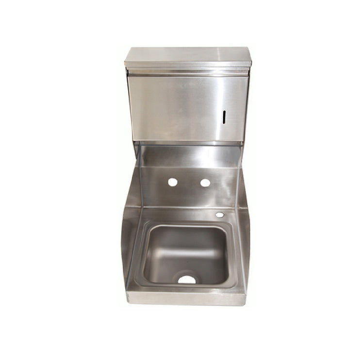 The NBR Equipment HS1-W2-LR-TD Space Saver Hand Sink Wall Mount is an expertly crafted solution designed for environments where space efficiency is paramount. With dimensions of 9 inches wide, 9 inches front-to-back, and a 4-5/16 inch deep bowl, this sink is ideal for compact spaces. It features 4-inch on-center splash mount faucet holes, providing practical installation options. The marine edge design helps prevent spillage, while the integral towel dispenser and deck mount soap dispenser offer convenient access for hygiene maintenance. Side splashes on both the left and right enhance its protective features against mess. The sink is equipped with a 2-inch drain hole and includes a basket drain along with wall mounting hardware, ensuring a complete setup out of the box. Constructed from 304 stainless steel, this sink combines durability with corrosion resistance, meeting NSF standards for public health and safety. Its thoughtful design caters to various segment markets, such as commercial kitchens, healthcare facilities, and food service operations, where space-saving solutions are crucial without compromising on quality and functionality.