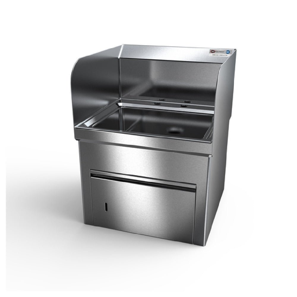 The NBR Equipment HS2-D2-S Handsink is a compact and efficient solution designed for diverse applications within the foodservice industry. Measuring 14 inches in width and 10 inches front-to-back, the sink includes a 5-inch deep bowl, making it an optimal choice for establishments with limited space that require reliable handwashing facilities. The sink is equipped with a set of deck mount faucet holes with 4-inch centers, allowing for easy installation of compatible faucets. Featuring an 18/304 stainless steel construction, this handsink is not only durable but also easy to maintain, ensuring long-term use and compliance with hygiene standards. The 1-7/8 inch drain opening efficiently manages water flow, and the included crumb cup (STN-2) prevents debris from clogging the system. Additional features include side splashes for added protection against water and a towel dispenser for convenience, enhancing its functionality in high-demand environments. Certified by NSF, this handsink meets public health and safety standards, making it a trusted choice for restaurants, cafes, and other foodservice operations. Its sturdy construction and thoughtful design make the NBR Equipment HS2-D2-S Handsink a valuable addition to any professional kitchen needing compact yet effective washing solutions.