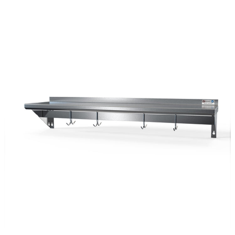 The NBR Equipment PS-1248 Shelf Wall Mount 48"W x 12"D is a versatile storage solution designed to meet the demands of commercial kitchens and various other professional environments. This shelf features an 18/300 series stainless steel construction, ensuring durability and long-term resistance to corrosion, making it ideal for high-moisture settings. Its dimensions of 48 inches in width and 12 inches in depth provide substantial storage space, while the stainless steel pot rack bar enhances its functionality, perfect for organizing kitchen equipment. The inclusion of eight stainless steel hooks adds further versatility, allowing for efficient hanging of cookware or utensils. A straight safety edge front minimizes the risk of injuries in bustling kitchen settings, while the 1-1/2-inch rear up-turn design prevents items from falling off the back, maintaining a tidy workspace. The NBR Equipment PS-1248 is NSF certified, signifying its compliance with rigorous public health and safety standards, making it a reliable choice for food service operations. This wall-mounted shelf is tailored to accommodate the diverse needs of restaurants, catering services, and other food-related businesses, offering a robust and practical solution for optimizing storage and organization within any professional kitchen setup.