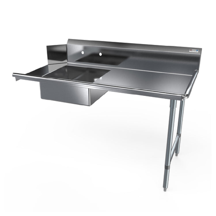 The NBR Equipment SDT-26R Economy Dishtable Soiled Straight Design is a practical and efficient solution for commercial kitchens that require a reliable and durable dishwashing station. Measuring 26 inches in width, 30-3/8 inches in depth, and 44 inches in height, this dishtable is engineered for right-to-left operation, optimizing workflow in busy environments. It features a 20-inch by 20-inch pre-rinse sink with an 8-inch depth, providing ample space for pre-cleaning tasks. The 10-inch high backsplash, designed at a 45-degree angle with a 2-inch return, effectively minimizes water spillage and keeps surrounding areas clean. Constructed from 18/300 series stainless steel, this dishtable offers superior corrosion resistance and longevity. Its rolled front and side rims add strength and safety by reducing sharp edges. The unit is equipped with one set of splash mount faucet holes with 8-inch centers, facilitating a straightforward installation of compatible faucets. Supported by galvanized legs, gussets, and bracing, and featuring adjustable plastic bullet feet, this dishtable ensures stability on uneven surfaces. Certified by NSF, the NBR Equipment SDT-26R is a versatile and essential component for any foodservice operation that prioritizes hygiene and efficiency in its dishwashing process.