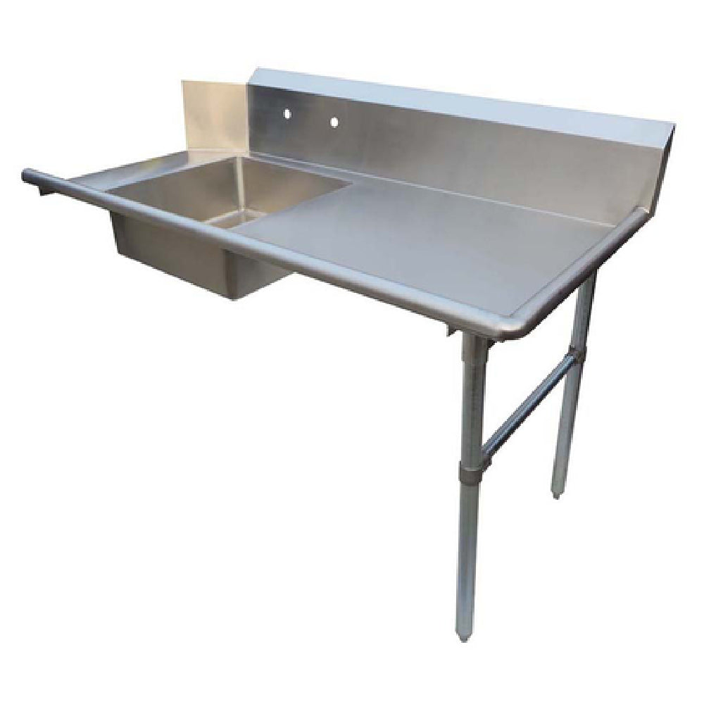 The NBR Equipment SDT-72R Economy Dishtable is designed with a focus on functionality and durability, specifically crafted for environments requiring efficient soiled dish handling. This dishtable features a straight design with dimensions of 72 inches in width, 30-3/8 inches in depth, and 44 inches in height. It supports right-to-left operation, optimizing workflow in busy kitchens. A notable feature is the 20-inch wide by 20-inch front-to-back pre-rinse sink with an 8-inch depth, facilitating effective pre-wash processes. Its 10-inch high backsplash is engineered with a 45-degree top and a 2-inch return, offering enhanced splash protection. The 1-inch turned down rear lip and splash mount faucet holes with 8-inch centers further contribute to its efficient design. The table’s rolled front and side rims provide added safety and ease of use. Constructed from 18/300 series stainless steel, it promises longevity and resistance to corrosion, while the galvanized legs, gussets, and bracing ensure structural stability. Adjustable plastic bullet feet allow for customization according to the workspace requirements. This product is NSF certified, assuring compliance with public health standards, making it an ideal choice for establishments focused on cleanliness and durability in their food service operations.