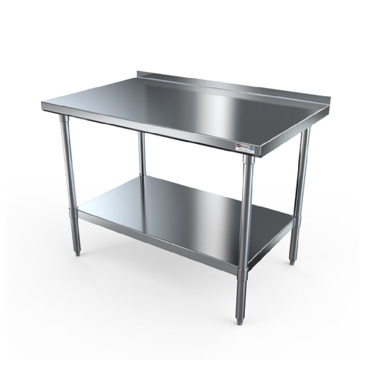 NBR Equipment, TS-6030R, Premium Work Table, 60"W x 30"D x 37-1/4"H overall size, 18/430 stainless steel top with 1-1/2"H rear up-turn, straight turndown on sides, 18 ga. stainless steel adjustable undershelf, (4) 1-5/8" dia. 16 ga. stainless steel legs, stainless steel adjustable gussets & adjustable bullet feet, NSF