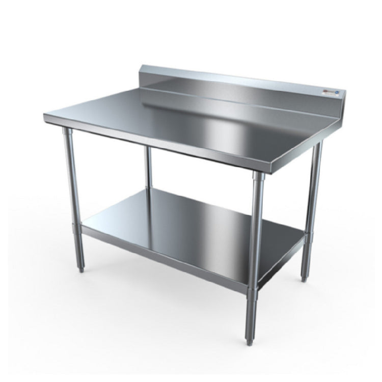 NBR Equipment, TS4-7230R5, Premium Work Table, 72"W x 30"D x 40-1/4"H overall size, 14/304 stainless steel top with 5"H backsplash, straight turndown on sides, 18ga stainless steel adjustable undershelf, (4) stainless steel legs & adjustable bullet feet, NSF