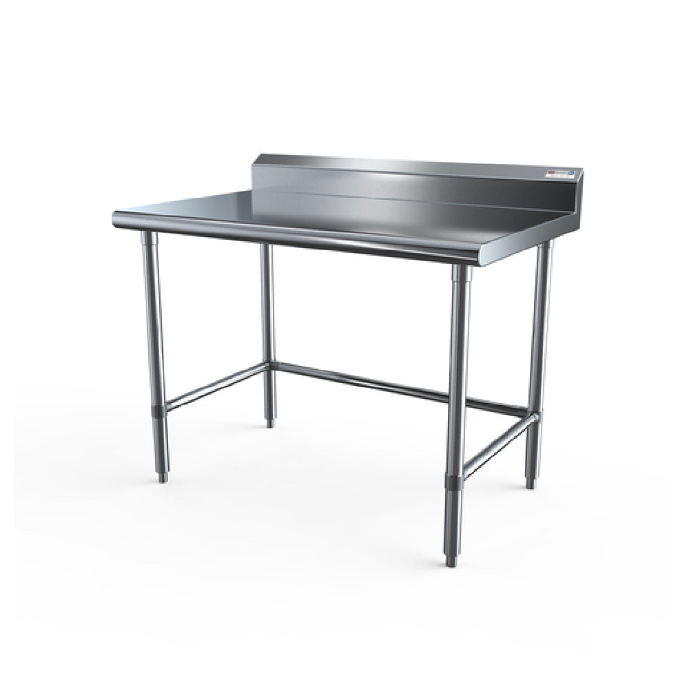 The NBR Equipment TS6-6030R5-X Premium Work Table is a highly functional and durable piece of equipment, boasting an overall size of 60"W x 30"D x 40-3/4"H. Its top is crafted from 16-gauge, 300-series stainless steel, providing robust and long-lasting performance suitable for demanding environments. The table features a 5" backsplash, which is essential for maintaining cleanliness and preventing spills, making it an ideal choice for commercial kitchens and food preparation areas. The 1-5/8" bullnose front edge offers added safety and comfort for users during intensive tasks. Supported by four stainless steel legs, alongside side and rear cross bracing, this table ensures stability and strength for heavy-duty use. The adjustable bullet feet allow for easy leveling on uneven surfaces, ensuring convenience and adaptability in various settings. Certified by NSF, this work table meets strict public health and safety standards, making it a dependable choice for professionals in the food service industry. The NBR Equipment TS6-6030R5-X is well-suited for restaurants, catering services, and other commercial applications that demand reliability and durability from their work surfaces.