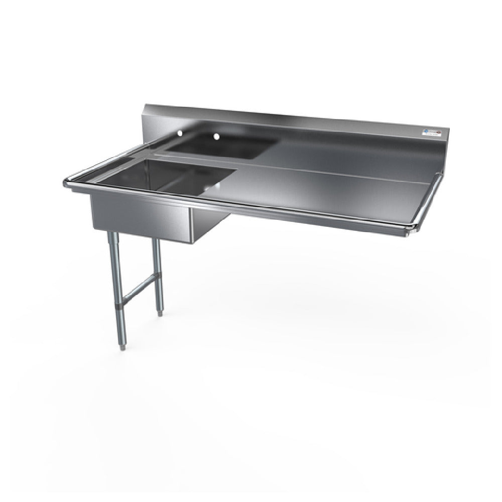 The NBR Equipment UDT-50L Undercounter Dishtable Soiled Straight Design is a meticulously engineered piece catering to the demands of commercial kitchens that require efficient soiled dish management. With an overall size of 50 inches in width, 30 inches in depth, and 43-1/2 inches in height, this dishtable is designed for left-to-right operation, optimizing workflow in busy kitchen environments. Its 20-inch by 20-inch front-to-back pre-rinse sink, with a depth of 8 inches, is perfect for pre-washing tasks. The 10-inch boxed backsplash, featuring a 45-degree top and 2-inch return, effectively contains splashes and spills. Additionally, the 3/4-inch turned down rear lip further enhances its functionality by preventing water runoff. It includes one set of splash mount faucet holes with 8-inch centers, accommodating various faucet types. Crafted from 18-gauge, 300-series stainless steel, the top surface ensures durability and long-lasting use, while the galvanized legs and bracing provide robust support. The adjustable plastic bullet feet ensure stability on uneven surfaces. Certified by NSF, this dishtable meets stringent public health standards, making it an indispensable asset for restaurants, hotels, and other food service operations aiming for high efficiency and hygiene.
