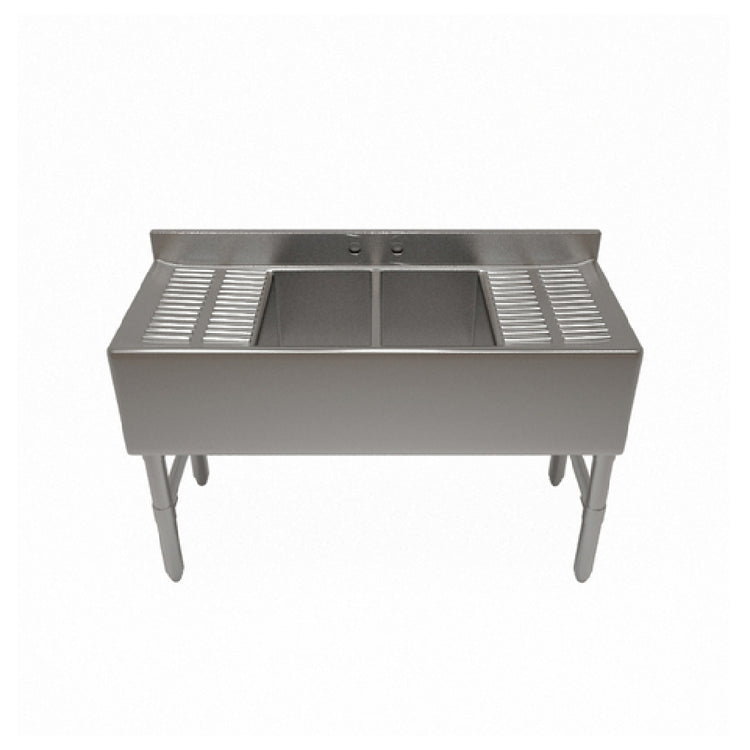 The NBR Equipment UW-4-101410-96LR Slim-Line Underbar Sink Unit is a meticulously designed four-compartment sink unit measuring 96"W x 18-1/4"D x 32-1/2"H. This underbar sink unit is crafted to meet the demands of various industry segments, especially suitable for bars, restaurants, and cafes requiring efficient space management without compromising functionality. Each of the four compartments is sized at 10"W x 14" front-to-back x 10" deep, offering ample room for multitasking and ensuring seamless workflow. The inclusion of left and right ribbed drainboards enhances convenience, providing designated areas for drying and draining. A 3-3/4"H backsplash is incorporated to minimize splatter and maintain a clean working environment. The unit is equipped with two sets of splash mount faucet holes with 4" centers, accommodating versatile plumbing configurations. Constructed from 18/300 series stainless steel, it promises durability and resistance against corrosion, complemented by stainless steel legs and side bracing for added stability. The adjustable plastic bullet feet ensure a leveled setup on uneven surfaces. Additional features include a marine edge to contain spills, 1-7/8" drains, and overflow stand pipes (SP-75), reinforcing its practicality. Certified by NSF, this sink unit stands out in its category for reliability and hygiene compliance.