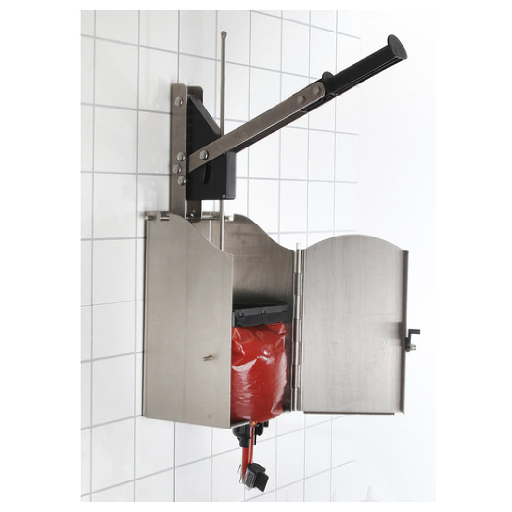 The Nemco 10975 High Volume Press-O-Matic Condiment Dispenser is engineered to meet the demands of high-volume food service environments. Measuring 18 inches wide by 10 inches deep and 17 inches high, this dispenser is designed for wall mounting and comes complete with all the necessary mounting hardware. Constructed from durable stainless steel, it ensures longevity and ease of cleaning, aligning with the rigorous standards of the food service industry. The ergonomic lever is a key feature, facilitating seamless and efficient condiment dispensing, which reduces user fatigue during extended use. This model is compatible with 1.5-gallon (6-quart) pouches, making it an excellent choice for establishments that require frequent condiment service, such as fast-food chains, cafeterias, and concession stands. Additionally, the dispenser is NSF certified, affirming its adherence to strict public health and safety regulations. By integrating this unit into your setup, you optimize service speed and condiment accessibility, enhancing overall operational efficiency. Its robust construction and design cater to diverse market segments within the food service industry, from large-scale dining facilities to small specialty eateries, promising reliability and performance in high-demand settings.