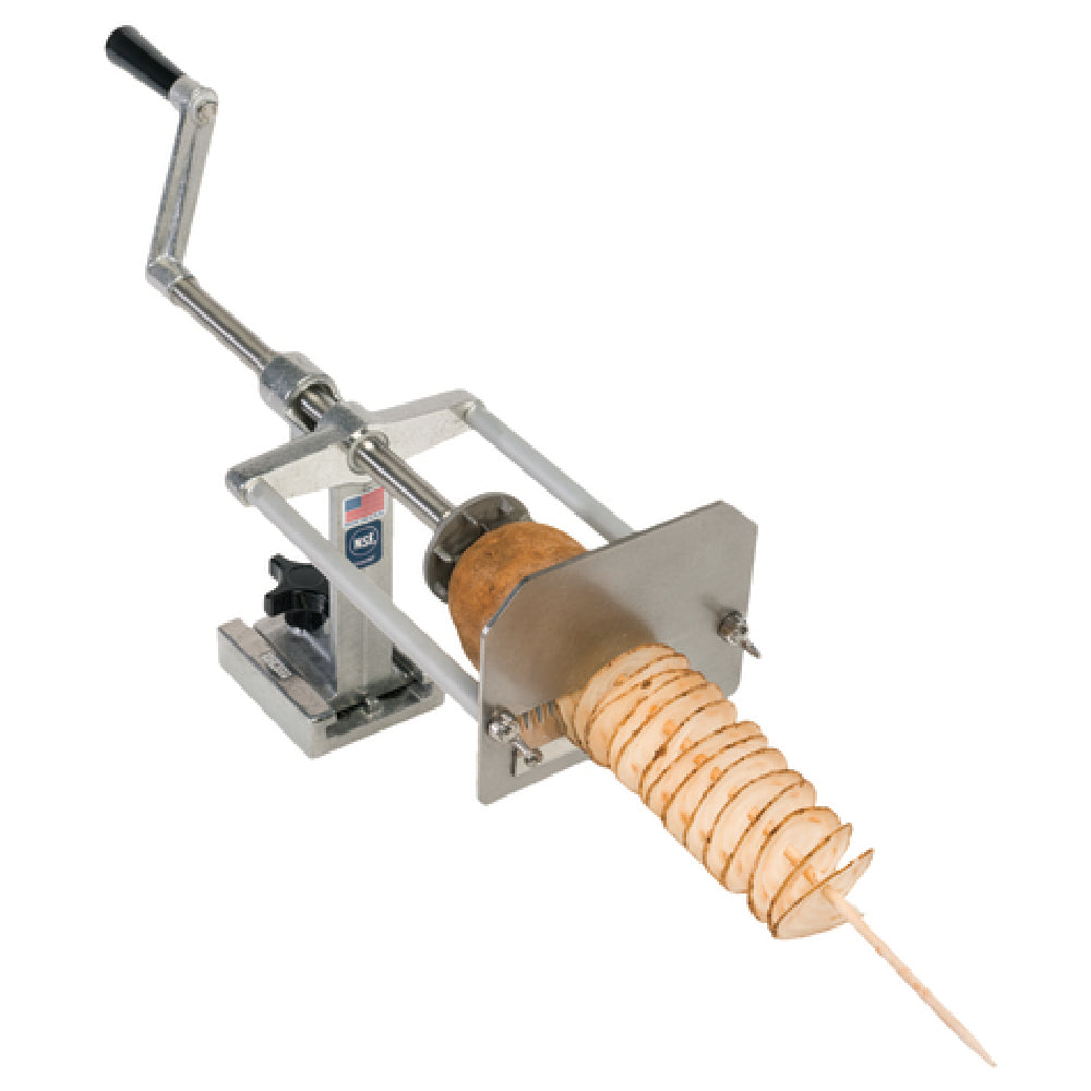 The Nemco 55050AN-WCT Spiral Fry™ Chip Twister Fry Kutter (wavy) is a manual device expertly engineered to transform potatoes into spiral and twisted fries with ease. This innovative fry cutter securely mounts on any flat surface, making it highly adaptable for both left and right-handed users. Featuring a preset drive depth, it ensures the potato holder avoids direct contact with the cutting blade, enhancing both safety and efficiency. The easy-action screw drive mechanism automatically retracts at the end of each stroke, allowing for rapid reloading and increased productivity in high-demand environments. Constructed from durable cast aluminum and stainless steel, this fry cutter is not only robust but also easy to clean, ensuring long-lasting use in busy kitchens. Certified by NSF, it meets high public health and safety standards, and being made in the USA, it reflects superior craftsmanship and quality. Whether in a bustling restaurant or a small-scale food service operation, the Nemco 55050AN-WCT offers exceptional performance and reliability, making it a valuable tool for professionals seeking to enhance their culinary presentations with uniquely shaped fries.
