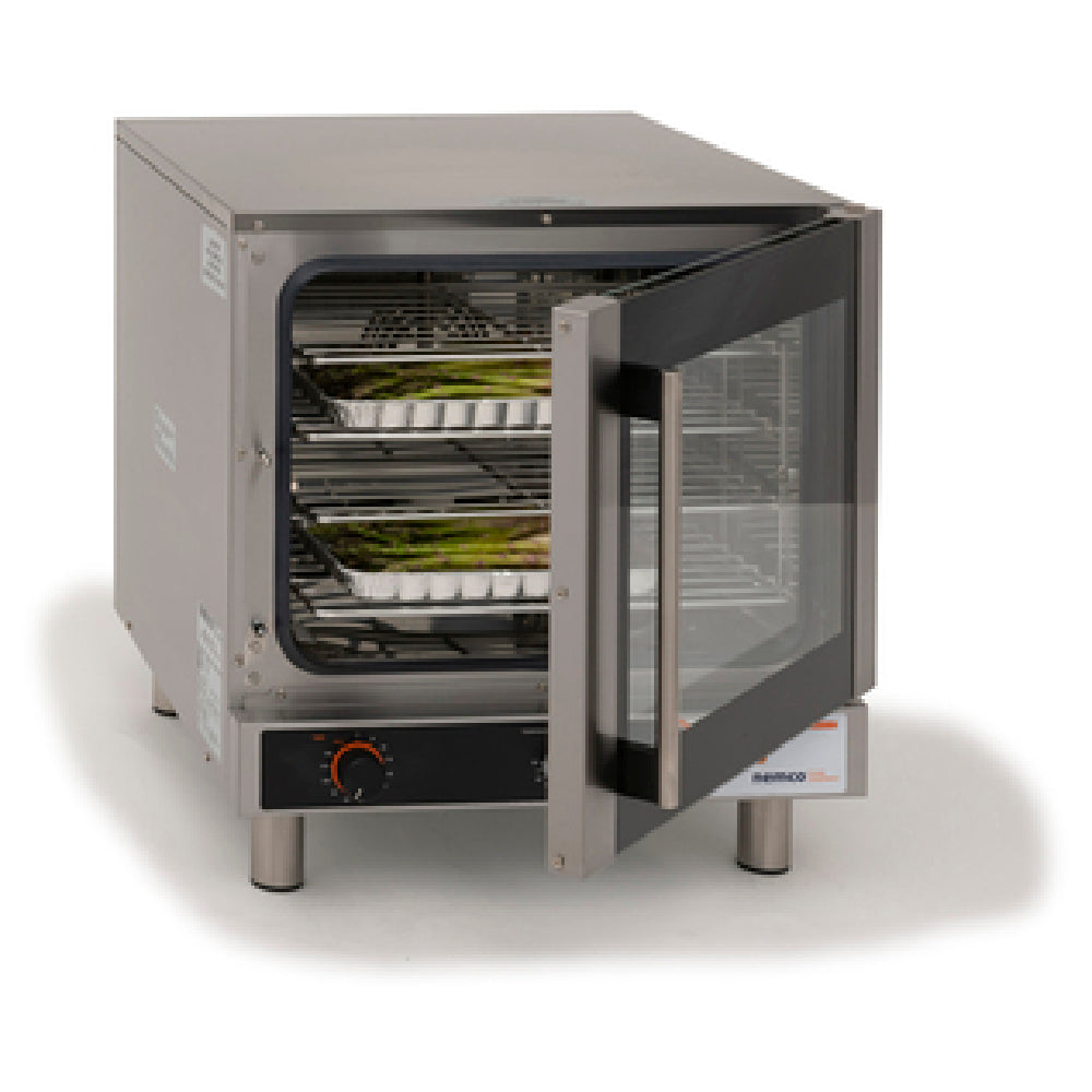 The Nemco 6235 Convection Oven With Steam Countertop Electric is a versatile cooking appliance designed for various culinary environments. This 1/2 size oven operates on electric power with manual controls and features a broad temperature range of 200°F to 500°F, accommodating diverse cooking requirements. The unit offers two distinct cooking modes - convection or convection with humidity/steam - providing flexibility for different recipes and textures. It can hold up to four half-size pans, maximizing its cooking capacity without occupying excessive countertop space. The inspection door, equipped with a recessed gasket, ensures secure sealing and efficient operation. Both the cooking chamber and exterior are constructed from stainless steel, ensuring durability and ease of maintenance. The oven is equipped with a NEMA 6-20P plug and operates at 2.9kW, drawing 13.0 amps, within a voltage range of 208-240v/60/1-ph. It meets cETLus and ETL-Sanitation standards, confirming its safety and hygiene compliance. This convection oven is an exceptional choice for professional kitchens seeking reliable performance and innovation in food preparation.