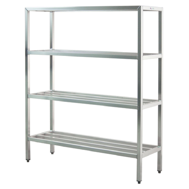 The New Age Industrial 1070 H.D. Series Shelving Unit - 4-tier - 42"W x 20"D x 72"H is a robust storage solution designed for various industrial applications. This shelving unit boasts a substantial shelf capacity of 1500 lbs, ensuring it can support heavy loads with ease. With a convenient 18-1/2" shelf clearance, it accommodates a variety of storage needs, from bulky items to numerous smaller components. Crafted from an all-welded 1-1/2" aluminum tube construction, this unit epitomizes durability and longevity, making it a reliable asset in demanding environments. The adjustable feet feature allows for precise leveling on uneven surfaces, enhancing stability and usability across diverse settings. Its NSF certification underscores its adherence to rigorous public health and safety standards, providing peace of mind for users in sectors such as food service and healthcare. Proudly made in the USA, the New Age Industrial 1070 H.D. Series Shelving Unit not only meets high manufacturing standards but also supports local industry. This versatile shelving solution is well-suited for various markets, including warehousing, commercial kitchens, and storage facilities, offering a blend of strength, practicality, and quality that addresses the unique needs of different professional environments.