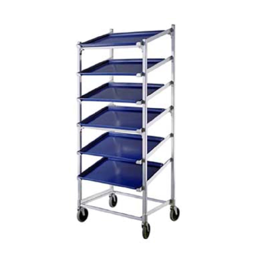 The New Age Industrial 1137 Slant Display Rack Mobile 28-1/2"W x 22"D x 70"H is a versatile fixture designed to enhance display and mobility in various market segments, including retail, food service, and hospitality. This display rack is engineered to accommodate seven 18" x 26" pans, each supported by slides set on 8-3/4" centers, offering ample space for organized product presentation. Constructed entirely from all-welded aluminum, the rack ensures durability and a lightweight build, conducive to frequent repositioning and long-lasting use. Its mobility is further enhanced by 5" stem casters, allowing for seamless movement within any commercial setting. Certified by NSF, the rack meets strict standards for public health protection, making it a reliable choice for environments where hygiene is paramount. Proudly made in the USA, this slant display rack combines quality craftsmanship with practical functionality, aligning with the needs of diverse industry segments seeking efficient and reliable display solutions. With its precise dimensions and robust construction, the New Age Industrial 1137 Slant Display Rack Mobile presents an exceptional option for businesses aiming to optimize their display areas with a product that is both practical and aesthetically pleasing.