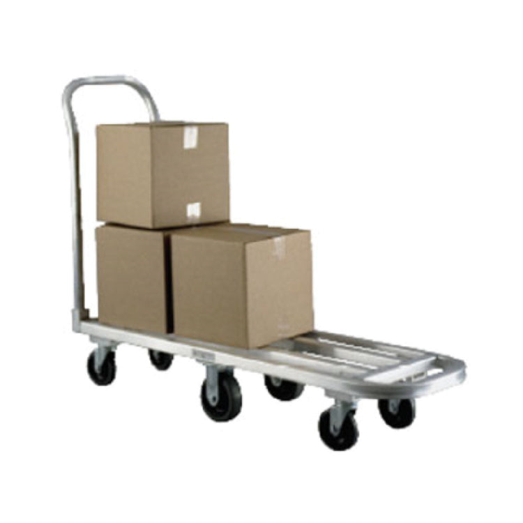The New Age Industrial 1184 Low Boy Stock Platform Truck is a highly efficient and durable transport solution, designed with a focus on versatility and strength for various industrial settings. With dimensions of 39"W x 14"D x 7-3/4"H, and extending to 40"H with the handle, it offers a compact yet spacious platform to accommodate substantial loads. This platform truck boasts a robust 1000 lbs. capacity, making it suitable for heavy-duty use in warehouses, factories, and other commercial environments. The well-engineered welded aluminum construction ensures longevity and resistance to corrosion, providing a reliable transport option for years to come. Equipped with casters - two 5" swivel and two 5" rigid - the truck offers exceptional maneuverability and stability, facilitating smooth navigation even in tight spaces. The removable handle adds flexibility, allowing for easy storage and versatility in handling different types of cargo. The truck's rounded front design further enhances safety and usability, minimizing the risk of damage to goods during transport. As an NSF-certified product, it adheres to stringent health and safety standards, underscoring its quality and dependability. Proudly made in the USA, the New Age Industrial 1184 Low Boy Stock Platform Truck is an indispensable asset for industries seeking robust and efficient material handling solutions.
