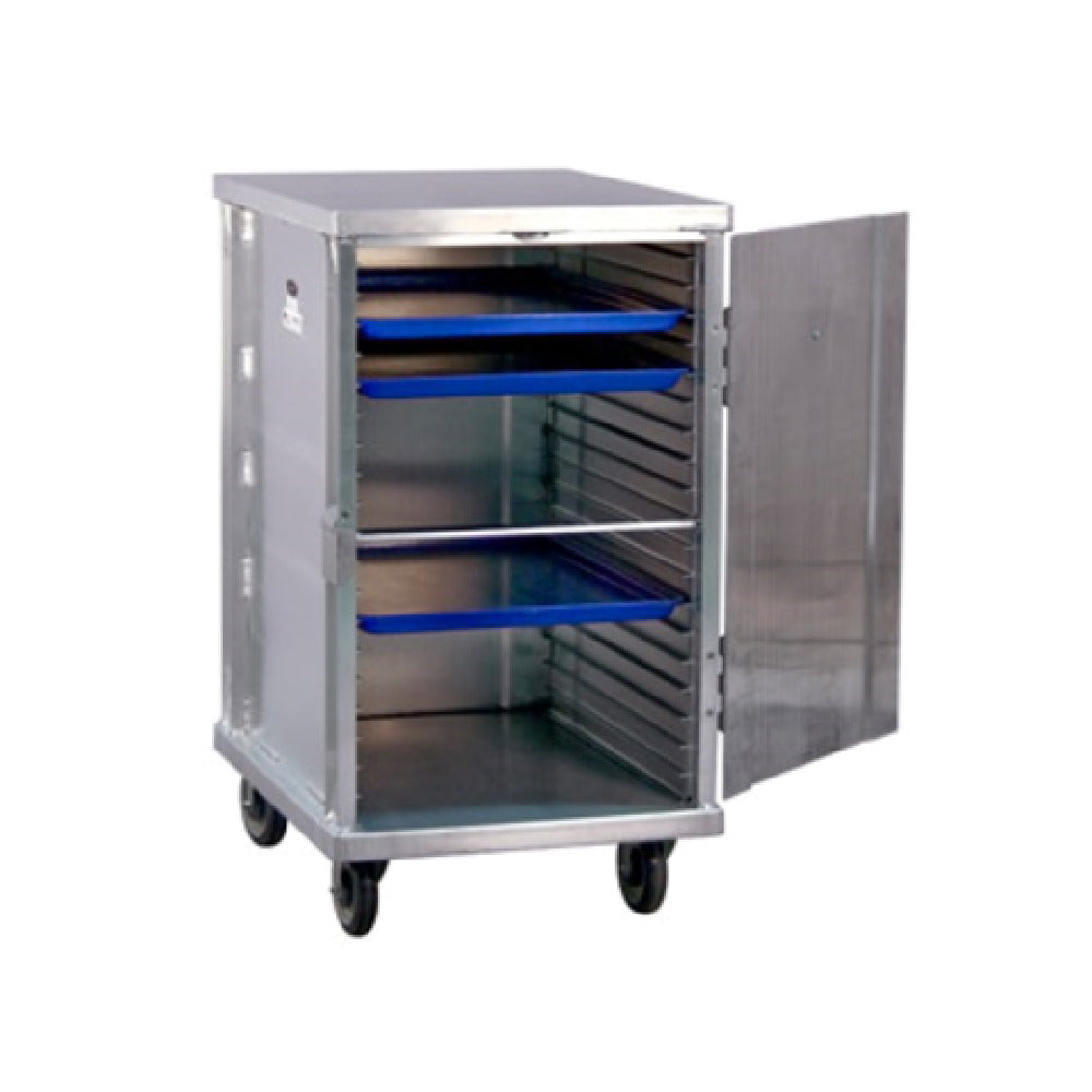 The New Age Industrial 1296 Pan Rack Mobile 1/2 Height is a versatile and robust storage solution crafted to meet the demanding needs of the food service industry. This enclosed cabinet boasts a capacity to hold up to 20 pans, each measuring 18" x 26". Its design features extrusions on 1-1/2" centers, providing ample space for various pan sizes. Constructed from all-welded aluminum, this pan rack ensures durability and longevity in a busy kitchen environment. The front-loading capability allows for easy access, streamlining operations in high-paced settings. Mobility is enhanced with four 5" platform swivel casters, making it effortlessly maneuverable across different workspaces. Certified by NSF, this product meets stringent public health and safety standards, assuring users of its quality and reliability. Proudly made in the USA, the New Age Industrial 1296 Pan Rack Mobile 1/2 Height is an ideal choice for bakeries, catering services, and commercial kitchens looking for a reliable and efficient pan storage solution. Its sturdy construction and thoughtful design make it a valuable addition to any professional setting where organized and accessible pan storage is essential.