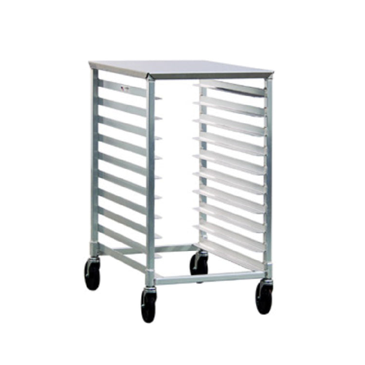 The New Age Industrial 1311 Bun Pan Rack Mobile Half-size is a versatile storage solution designed for modern foodservice environments. Featuring an all-welded aluminum construction, this rack is built for durability and long-lasting performance. With a 10-pan capacity, it efficiently accommodates various pan sizes including 18" x 26", 14" x 18", and 13" x 18", making it suitable for diverse culinary needs. The open sides and end loading design allow for easy access and organization of pans. The slides are positioned on 3" centers, optimizing space and ensuring a secure fit for all accommodated pan sizes. Reinforced uprights add to the rack's structural integrity, while the stainless steel top provides an additional layer of durability and ease of cleaning. Mobility is enhanced with four 5" stem swivel casters, allowing for smooth movement across kitchen floors. This product is NSF certified, signifying its compliance with strict public health and safety standards. Proudly made in the USA, the New Age Industrial 1311 Bun Pan Rack is perfect for bakeries, commercial kitchens, and foodservice establishments seeking a reliable, space-efficient, and easy-to-use storage solution. Its robust construction and practical design make it an essential tool in any professional culinary setting.