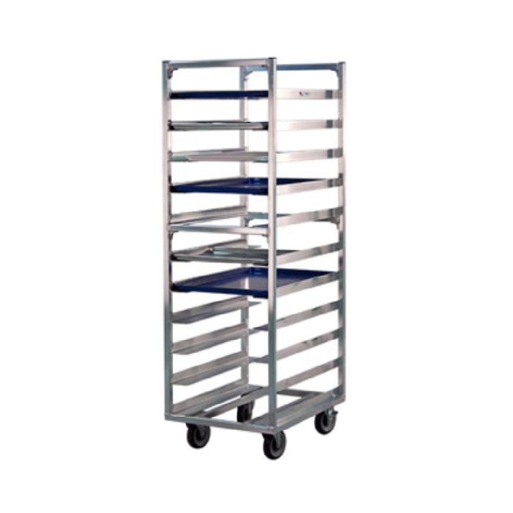 The New Age Industrial 1336 Roll-In Refrigerator/Proofer Rack - universal and open frame design - stands at 64 inches high, providing an adaptable solution for various food service environments. Designed with wide angle slides, it can accommodate up to eleven 18" x 26" pans, with slides positioned approximately 5 inches apart. This ensures optimal space utilization and easy access, catering to the diverse needs of bakeries, commercial kitchens, and catering services. Its all welded aluminum construction ensures durability and longevity, while the end loading feature enhances convenience during operation. Equipped with four 5-inch platform casters, including two swivel and two swivel with brakes, the rack offers smooth mobility and secure positioning when needed. Certified by NSF, it meets rigorous health and safety standards, reaffirming its quality and reliability in professional settings. Proudly made in the USA, the New Age Industrial 1336 Roll-In Refrigerator/Proofer Rack is a versatile and indispensable tool for industries that require efficient storage and proofing solutions, particularly those that prioritize ease of access and robust construction.