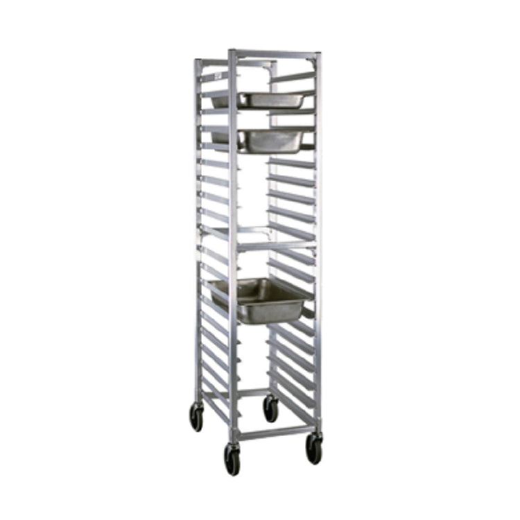 The New Age Industrial 1505 Steam Table Pan Rack Full Height Open Sides is expertly crafted to accommodate a variety of culinary needs with its impressive features. This rack is designed to hold 18 steam table pans measuring 12" x 20", and its slides are strategically placed on 3" centers to maximize storage efficiency. Constructed from all-welded aluminum, it provides superior durability and longevity, making it a reliable choice for high-volume kitchens. The open sides allow for easy access and loading from the ends, enhancing workflow efficiency. The inclusion of 5" stem casters ensures mobility, allowing the rack to be easily maneuvered within any food service environment. Made in the USA, this steam table pan rack meets NSF standards, emphasizing its commitment to quality and safety in food handling. Its robust design is ideal for catering businesses, restaurants, and institutional kitchens that require efficient and organized storage solutions. By combining functionality with high-quality construction, the New Age Industrial 1505 Steam Table Pan Rack stands as a versatile and essential addition to any professional kitchen setting.