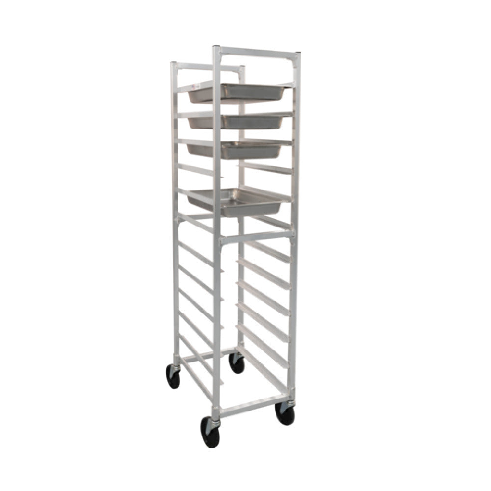 The New Age Industrial 52199 Steam Table Pan Rack Full Size Open Sides is a robust and versatile solution designed for efficient storage and transportation of steam table pans. Engineered with precision, this pan rack accommodates up to ten 12" x 20" pans, offering ample space for high-volume kitchen operations. The rack's open sides facilitate easy access and loading, while its end-loading design ensures seamless integration into various kitchen workflows. Constructed from all-welded aluminum, the rack boasts exceptional durability and lightweight maneuverability. The stainless steel top enhances its strength and adds a sleek finishing touch. Standing 35" high, this pan rack is equipped with four 5" stem type casters, providing smooth and reliable mobility across the workspace. Proudly made in the USA, the New Age Industrial 52199 Steam Table Pan Rack stands out in the food service industry for its durable construction and practical design. Ideal for catering businesses, restaurant kitchens, and institutional settings, this pan rack delivers on both functionality and reliability, making it a valuable asset for professionals who demand efficiency and quality in their operations.
