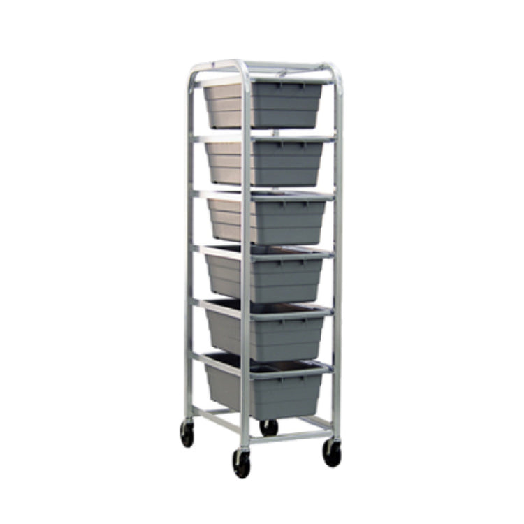 The New Age Industrial 6263 Lug Dolly Open Frame 19-3/4"W x 26-3/4"D x 71"H is a highly durable and versatile product designed for both commercial and industrial applications. Featuring an all-welded aluminum construction, this lug dolly ensures longevity and robustness, capable of meeting the rigorous demands of various industries. It accommodates six lugs, each measuring 16"W x 25"D x 8-1/2"H, providing ample storage and transportation capacity for your operational needs. The dolly is equipped with four 5" swivel stem casters, facilitating smooth and effortless mobility across different floor surfaces. Its open frame design not only enhances ease of access but also improves ventilation for stored items, making it particularly suitable for environments that require hygiene and cleanliness, as it is NSF certified. Proudly made in the USA, the New Age Industrial 6263 Lug Dolly is ideal for industries that prioritize quality and efficiency in their material handling processes, providing a reliable solution for the transportation and storage of goods. This product's robust design and thoughtful features make it a valuable asset in commercial kitchens, manufacturing facilities, and distribution centers.