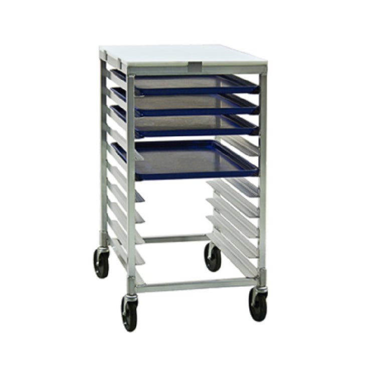 The New Age Industrial 92096 Pan Rack Mobile 1/2 Size Height is a versatile and durable solution for commercial kitchens, designed to accommodate a variety of pan sizes, including 18" x 26", 14" x 18", or 13" x 18". With a 10-pan capacity, it offers efficient storage and organization for bakeries, catering services, and food preparation areas. The rack features open sides and slides on 3" centers, facilitating easy access and loading from the end. Constructed from all-welded aluminum, it ensures long-lasting durability and stability, while the reinforced uprights provide additional support. This pan rack includes a poly top for added functionality and is equipped with four 5" stem swivel casters, allowing for smooth mobility within any kitchen setting. As an NSF-certified product, it meets stringent public health and safety standards, ensuring reliability and safety in food service operations. Proudly made in the USA, the New Age Industrial 92096 Pan Rack combines practicality and robust engineering, making it a valuable asset in any commercial kitchen environment.