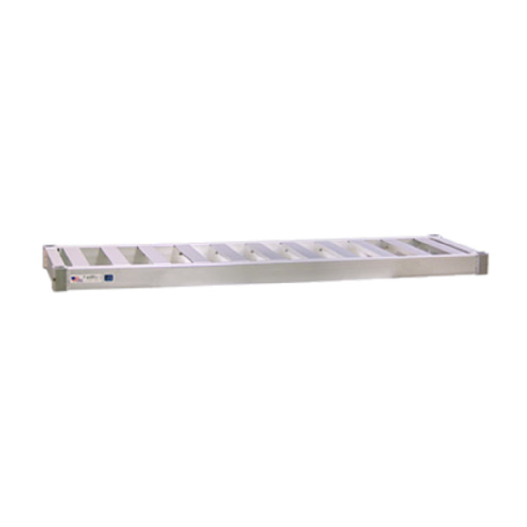 The New Age Industrial 94273 Keg Shelf is a specialized storage solution with dimensions of 60"W x 18"D x 3"H, designed to efficiently accommodate various keg sizes. This shelf can hold up to three 1/2 barrel kegs or nine 1/6 barrel kegs, providing flexible options for breweries, bars, and restaurants that require adaptable storage capabilities. Constructed with durable aluminum, this shelf ensures long-lasting performance and resistance to corrosion, making it ideal for both indoor and outdoor settings. The "T"-Bar shelf design contributes to its structural integrity and supports even weight distribution across the shelf. Proudly manufactured in the USA, this keg shelf meets NSF standards, guaranteeing its compliance with public health and safety requirements. The New Age Industrial 94273 Keg Shelf is especially valuable for establishments prioritizing efficient space utilization and reliable organization in their keg storage solutions, reflecting a commitment to quality and practicality in keg storage equipment.