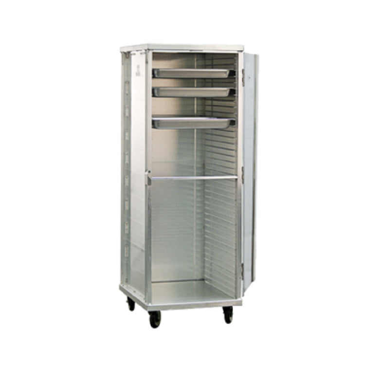 The New Age Industrial 95141 Pan Rack Mobile Full Height is a specialized storage solution designed for efficient kitchen operations. This enclosed pan rack is expertly crafted with all-welded aluminum construction, ensuring durability and longevity. It features slides to accommodate up to 24 pans, each measuring 12" x 20", with slides positioned on 1-1/2" centers for optimal storage efficiency. The end loading design facilitates ease of access, enhancing workflow in busy environments. Built with a heavy-duty base, this pan rack ensures stability even when fully loaded. Mobility is seamlessly integrated with four 5" platform swivel casters, allowing for easy maneuverability across various kitchen settings. NSF certification underscores its compliance with health and safety standards, making it a reliable choice for professional kitchens. Proudly made in the USA, this pan rack is a testament to quality craftsmanship. Its full-height design maximizes vertical space, catering to the needs of diverse segments within the foodservice industry, from bustling restaurants to industrial-sized food preparation areas. The New Age Industrial 95141 Pan Rack Mobile Full Height is an essential asset, combining robust construction with practical features to support the dynamic demands of modern kitchen operations.