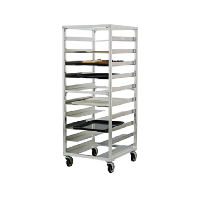 The New Age Industrial 96058 Universal Tray Rack Mobile Full Height is an expertly crafted storage solution designed for optimal versatility and functionality in industrial and commercial settings. This tray rack features open sides, accommodating a range of oval tray sizes including 18" x 26", 12" x 20", 22-3/4" x 27-5/8", 20-3/4" x 25-1/2", and 23-1/2" x 29", making it suitable for diverse culinary operations. With a capacity to hold 10 trays on 6" centers, it efficiently maximizes storage space while maintaining easy access to each tray. Constructed from all-welded aluminum, this rack ensures durability and longevity, even in high-demand environments. The inclusion of 5" platform swivel casters enhances mobility, allowing for effortless movement and repositioning within kitchens or storage areas. Certified by NSF, this tray rack meets high public health and safety standards, making it a reliable choice for food service establishments. Proudly made in the USA, the New Age Industrial 96058 tray rack is a testament to quality craftsmanship, providing a robust and adaptable solution for businesses looking to optimize their storage capabilities with a dependable and versatile unit.