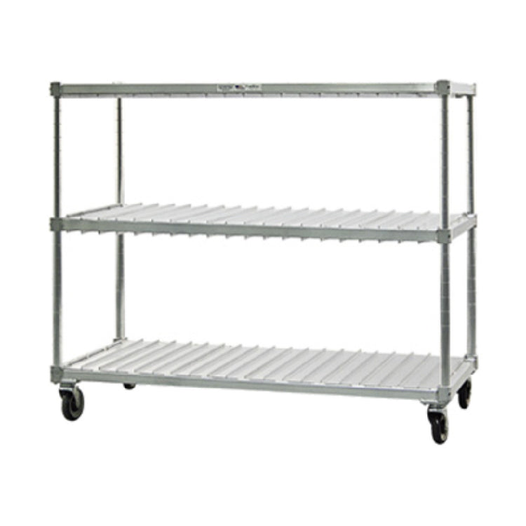 The New Age Industrial 96090 Tray-Drying Rack Mobile 2 Tray Levels is a premier solution for establishments requiring efficient tray drying and storage. Engineered with precision, this mobile tray rack accommodates 40 trays, with 20 trays fitting on each of its two levels, specifically designed to house 18" x 26" trays. The rack is built with a substantial 2.65" angle spacing that supports optimal air circulation between trays, enhancing drying efficiency. This robust unit is constructed from heavy-duty aluminum, ensuring durability and longevity in environments demanding high performance and strength. The inclusion of four 5" platform casters enhances its mobility, allowing for easy relocation within various operational spaces, making it an excellent choice for bakeries, catering services, and industrial kitchens. The unit is shipped knocked down (KD) for convenient assembly and space-saving transportation. Proudly made in the USA, it meets NSF standards for safety and quality, reinforcing its reliability and suitability in professional settings committed to maintaining high hygiene standards. The New Age Industrial 96090 Tray-Drying Rack is a versatile and resilient choice for diverse market segments seeking superior tray storage and drying solutions.