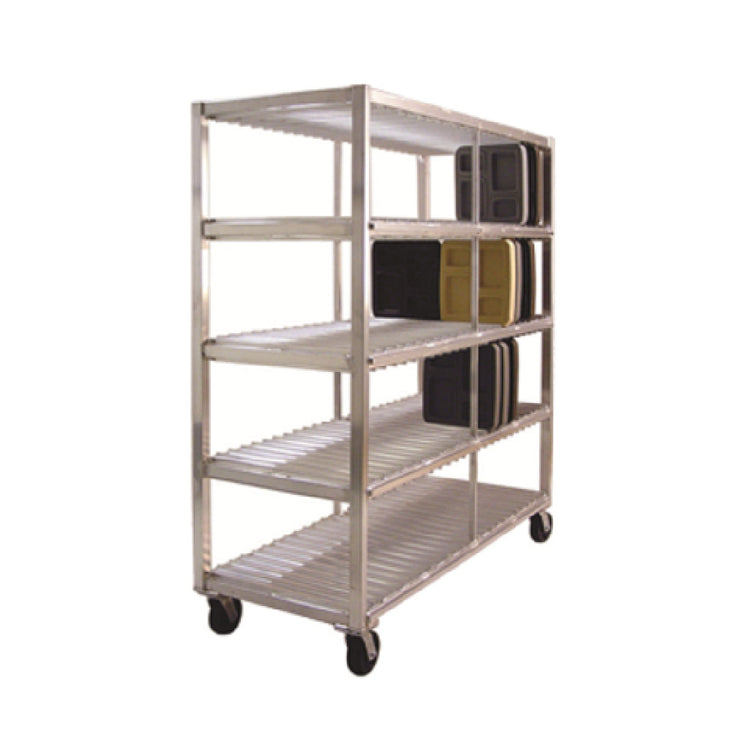 The New Age Industrial 96709 Tray Drying Rack Mobile 4 Tray Levels is a highly efficient and robust solution designed to meet the rigorous demands of industrial kitchens and food service operations. Engineered with precision, this rack features four tray levels, accommodating up to 320 trays, making it an indispensable asset for high-volume establishments. Its dimensions - 28-1/2"D x 82"H x 63-1/2"W - optimize space utilization while ensuring easy access and organization. The all-welded construction enhances durability, ensuring long-term reliability in demanding environments. The rack's angle spacing is set at 1-2/5" for efficient drying and drainage, further supported by integrated drainage wells that prevent water accumulation. Mobility is enhanced by four 6" x 2" polyolefin platform swivel casters equipped with tamper-proof fasteners, allowing seamless transportation across various floor surfaces. Proudly made in the USA, this tray drying rack complies with NSF standards, demonstrating its commitment to safety and quality. This custom unit requires a sample tray with order for precise customization, and returns are not accepted, emphasizing the tailored nature of this high-performance unit in professional settings. Its robust design and exceptional capacity make it a valuable investment for diverse markets within the food service industry.