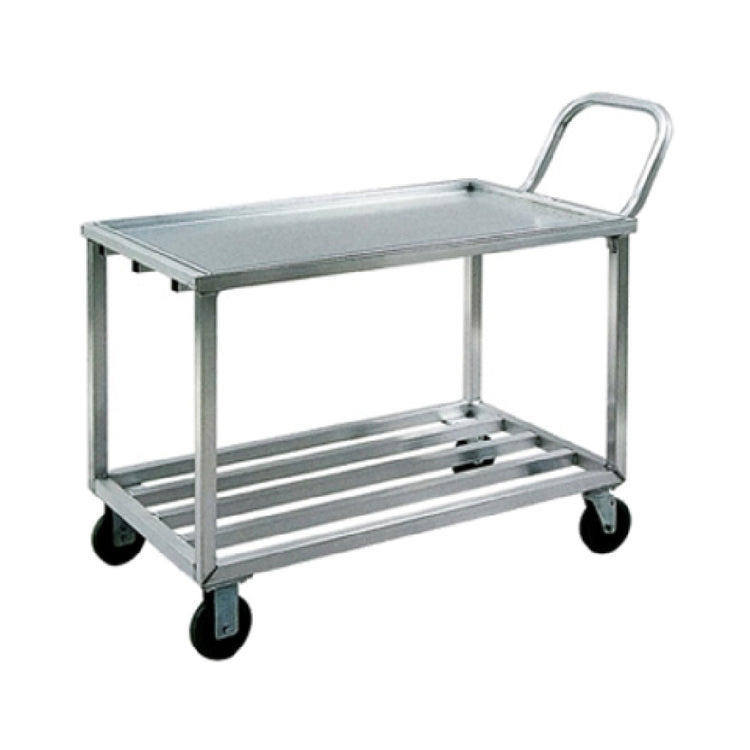 The New Age Industrial 97126 Wet Produce Cart Mobile 24-3/8" x 52" is a robust and versatile solution designed for the efficient handling and transport of wet produce. With a substantial 700 lbs capacity, this cart caters to the demanding needs of various industry sectors, including supermarkets, restaurants, and food processing facilities. Its all-welded aluminum construction ensures durability and longevity, making it a reliable asset for daily operations. The cart features a wrap-around bumper on the top shelf, providing added protection and reducing the risk of damage during transport. Equipped with four 5" platform casters, including four swivel and two rigid, it offers excellent mobility and maneuverability, essential for dynamic work environments. Removable solid shelves enhance its practicality, allowing for easy cleaning and customization according to specific storage needs. Certified by the NSF, this cart aligns with industry standards for safety and sanitation, and its construction is proudly made in the USA. The New Age Industrial 97126 Wet Produce Cart Mobile stands out in its category, combining strength, function, and compliance, making it an ideal choice for businesses looking to optimize their produce handling processes.
