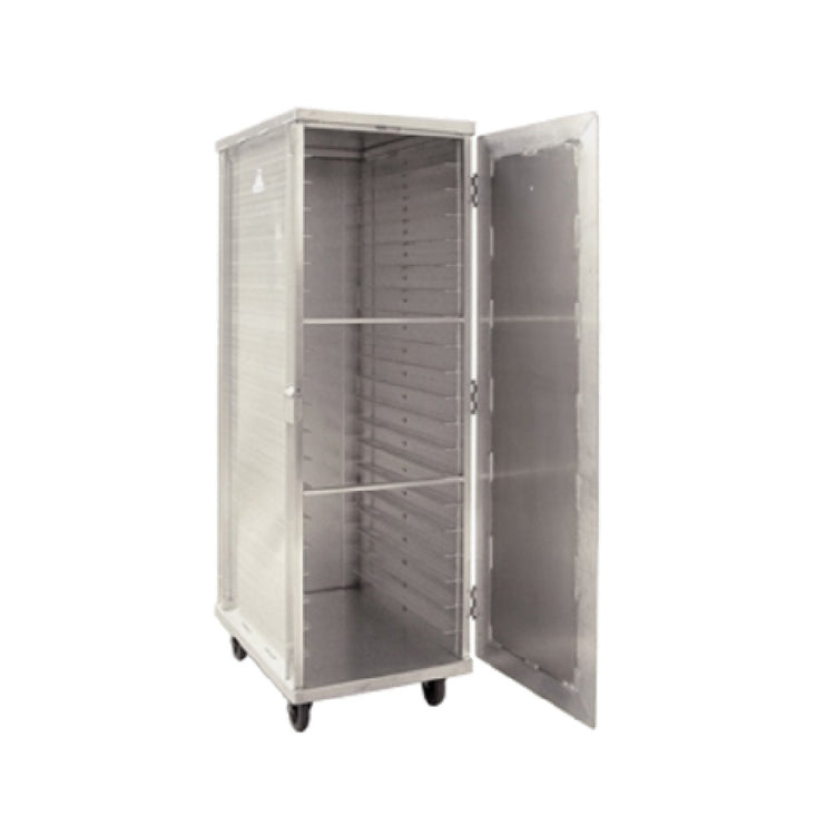 The New Age Industrial 97718 Transport Cabinet is a mobile, full-height unit expertly designed for efficient storage and transportation in various professional settings. With a capacity to accommodate 20 pans measuring 18" x 26", this transport cabinet maximizes space utilization within its compact structure. The incorporation of angle runners spaced on 3" centers ensures secure and organized storage of pans, enhancing operational efficiency. Built with aluminum construction, it promises durability and long-lasting performance, making it suitable for demanding environments. The cabinet features a reinforced door, providing additional security and stability during transport. Its heavy-duty base supports the structural integrity, while the front-loading design allows for easy access to contents. Equipped with four 5" platform swivel casters, the cabinet ensures smooth and effortless mobility across various surfaces. The NSF certification highlights its adherence to rigorous safety and hygiene standards, making it an excellent choice for food service industries. Proudly made in the USA, the New Age Industrial 97718 Transport Cabinet is a reliable and versatile solution, offering exceptional value to professional kitchens and industrial operations seeking robust storage and transport capabilities.