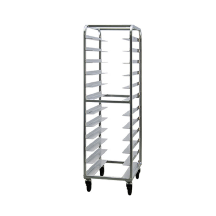 The New Age Industrial 97745 Tray Retrieval Rack Mobile Full Height is an expertly designed unit tailored for efficient tray handling in various food service environments. This mobile, full-height rack is engineered with open sides to facilitate easy access and handling of trays, with a capacity to accommodate up to 24 trays measuring 14 inches by 18 inches, including both trapezoid and round shapes. The rack features a 5-inch angle spacing between trays, ensuring adequate air circulation and space for versatile tray storage options. Built with durable aluminum construction, this tray retrieval rack emphasizes long-lasting performance and corrosion resistance, essential for maintaining hygienic standards in demanding food service operations. With its end-loading design, users can effortlessly load and retrieve trays, enhancing operational efficiency in high-paced settings. The rack is equipped with 5-inch platform swivel casters, allowing for smooth mobility and easy repositioning within the kitchen or service area. Certified by NSF, this product assures compliance with public health and safety standards and is proudly made in the USA, highlighting its high-quality craftsmanship. The New Age Industrial 97745 tray retrieval rack meets the needs of diverse market segments, including institutional kitchens, catering services, and restaurant establishments, by providing a reliable and efficient solution for tray storage and handling.