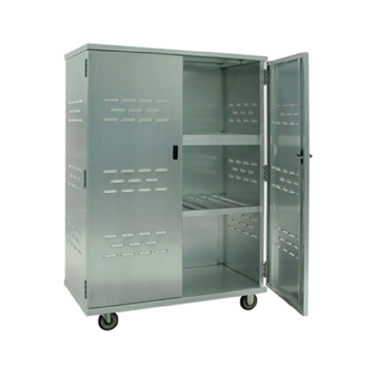 The New Age Industrial 98167 Security Cage Solid is a meticulously designed storage solution ideal for various industrial sectors. With dimensions of 49-1/4"W x 25-1/2"D x 70-1/2"H, it offers ample space while maintaining a compact footprint. The unit includes two 24" x 45" intermediate shelves, providing organized storage options for diverse applications. Its double doors are equipped with a stainless steel hasp, ensuring secure closure, and the replaceable stainless steel hinges add to its durability and longevity. Constructed from all welded aluminum, this security cage promises robustness and resistance to wear and tear, making it a reliable choice for demanding environments. It features four 5" plate casters, including two swivel and two rigid, facilitating easy mobility and positioning within your facility. Made in the USA, the New Age Industrial 98167 Security Cage Solid exemplifies quality craftsmanship and engineering excellence. This product serves a wide array of industrial needs, from secure storage in warehouses and factories to organized inventory management in retail settings, offering exceptional utility and peace of mind. Its thoughtful design and construction make it a versatile and indispensable asset for any industry requiring secure storage solutions.