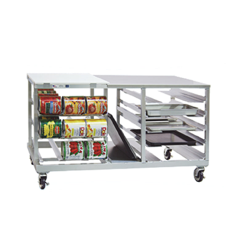The New Age Industrial 99135 Prep Table is a mobile unit expertly designed for multifunctional utility in commercial kitchen environments. With dimensions of 60"W x 36"D x 34-9/16"H, this prep table is ideal for diverse culinary tasks. Its standout feature is the five-in-one functionality - integrating can storage, a cutting surface, pan storage, and a universal pan rack. It efficiently accommodates up to 54 #10 cans and 72 #5 cans, addressing the storage needs of busy kitchens. The table is equipped with a 5/8" thick poly top cutting board, delivering a durable and hygienic surface for food preparation. The universal pan rack features 5" stepped angled runner spacing, optimizing organization and accessibility. Constructed with a 16-gauge stainless steel work top, it promises robustness and easy maintenance. Mobility is enhanced by four 5" casters, all fitted with brakes, ensuring stability and ease of movement within dynamic kitchen spaces. Proudly made in the USA, the New Age Industrial 99135 Prep Table stands as a testament to high-quality craftsmanship and is a versatile asset for food service operations seeking reliable, multifunctional equipment.