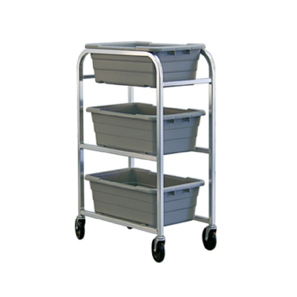 The New Age Industrial 99304 Lug Dolly/Bussing Cart is an exceptional tool tailored for efficient material handling and transportation within various industries. With a 3 lug capacity, it accommodates lug sizes of 15-1/2" x 25" x 8-3/4", although the lugs are not included with the purchase. Crafted from aluminum with an all welded construction, this cart ensures robust durability and long-lasting performance. It boasts a substantial load capacity of 500 lb., making it suitable for handling heavy loads with ease. The cart is fitted with four 5" stem swivel casters, model #C480, providing excellent maneuverability, which is essential in fast-paced working environments such as commercial kitchens, warehouses, or manufacturing facilities. Proudly made in the USA, the New Age Industrial 99304 Lug Dolly/Bussing Cart blends high-quality craftsmanship with practical functionality, making it an indispensable asset for businesses that require reliable equipment for daily operations. Its design focuses on optimizing workflow efficiency, catering to sectors that demand high performance and resilience in their material handling solutions. Whether used in food service or industrial contexts, this lug dolly/bussing cart is engineered to meet the rigorous demands of professional settings.