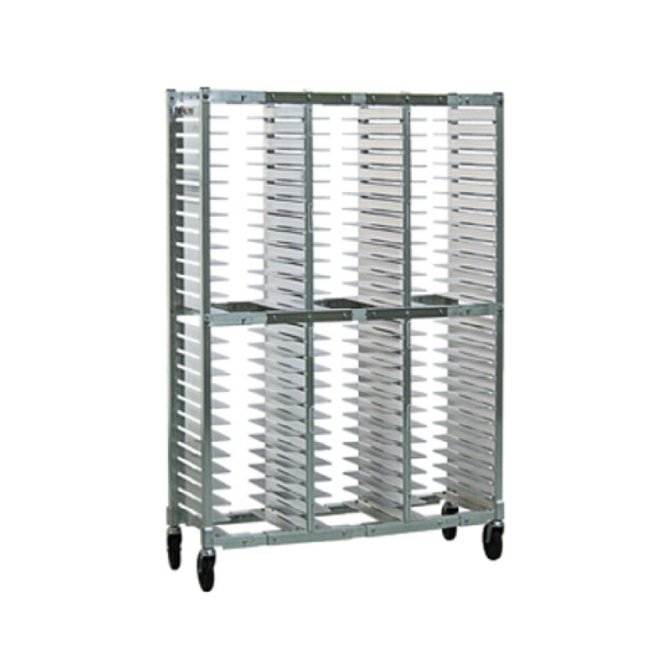 The New Age Industrial NS596A Pizza Pan Rack Mobile Full Height is a versatile and practical storage solution for professional kitchens. This mobile rack is designed to accommodate 78 pizza pans, with adjustable widths in 1-inch increments to securely hold pans ranging from 10 inches to 16 inches in diameter. The rack offers a unique configuration with 2-inch spacing and the capacity for pans to be arranged 3 wide and 2 high, maximizing storage efficiency. Crafted from durable aluminum construction, the rack is both lightweight and robust, ensuring longevity in demanding environments. Its open-sided design facilitates easy access and loading from the front and end, enhancing operational efficiency in busy kitchens. The mobility of the NS596A is ensured by four 5-inch stem swivel casters (#C480), allowing for effortless maneuverability across workspaces. Delivered as a knockdown (KD) unit, this rack is made in the USA, reflecting high manufacturing standards. The New Age Industrial NS596A Pizza Pan Rack is an essential asset for pizzerias, bakeries, and food service establishments that require flexible, efficient, and reliable pizza pan storage solutions.