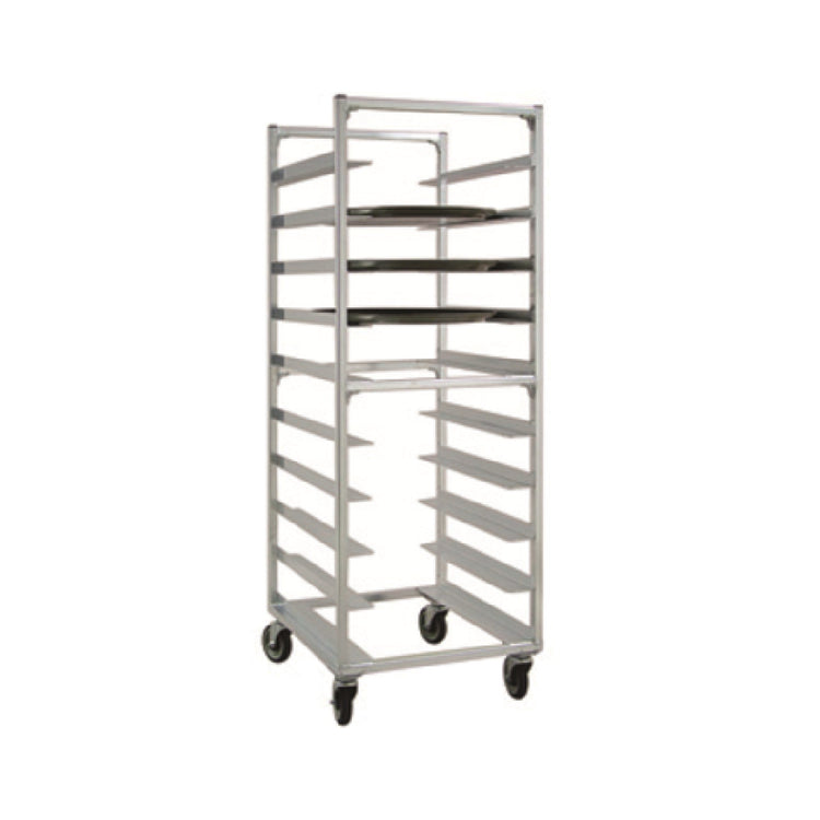 The New Age Industrial NS893 Tray Rack Mobile 69-3/4" H is a highly versatile and efficient solution for food service operations requiring robust tray management. This mobile unit is designed with open sides and accommodates slides for ten 22" x 26-7/8" oval trays. The slides are strategically positioned on 6-inch centers, allowing for optimal spacing and ease of access. Constructed with all-welded aluminum, the NS893 boasts exceptional durability and strength, ensuring long-lasting performance in demanding environments. The end loading feature enhances convenience, allowing for straightforward insertion and removal of trays. Mobility is a key aspect of this tray rack, facilitated by four 5-inch platform swivel casters that enable smooth maneuverability across various surfaces. Certified by NSF, this tray rack adheres to stringent public health and safety standards, making it a reliable choice for industries that prioritize hygiene and quality. Proudly made in the USA, the New Age Industrial NS893 Tray Rack Mobile is an excellent addition to professional kitchens or catering services, delivering a combination of functionality, mobility, and durability tailored for diverse market needs within the food service industry.