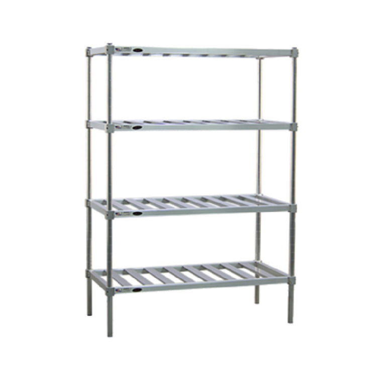 The New Age Industrial P2460 Pot & Pan Rack Stationary 4-tier offers a robust solution for kitchens requiring substantial storage capabilities. Measuring 60"W x 24"D x 76"H, this rack is crafted from durable aluminum alloy, ensuring longevity and resistance to corrosion. The T-Bar shelf design is a standout feature, allowing for adjustments in 2" increments, which provides flexible storage options to accommodate various pot and pan sizes. With a remarkable 900 lb. capacity, the P2460 can support a significant weight, making it suitable for both small kitchens and larger culinary operations. Certified by NSF, this rack meets strict public health standards, ensuring that it is a safe and reliable choice for professional environments. The product is offered in a knockdown (KD) format, simplifying assembly and transportation. Proudly made in the USA, the New Age Industrial P2460 Pot & Pan Rack is a versatile storage solution ideal for different market segments within the food service industry, from bustling restaurants to catering services, emphasizing practicality and quality. The rack’s stationary design provides a stable and dependable storage option that maximizes kitchen efficiency while maintaining high standards of safety and durability.