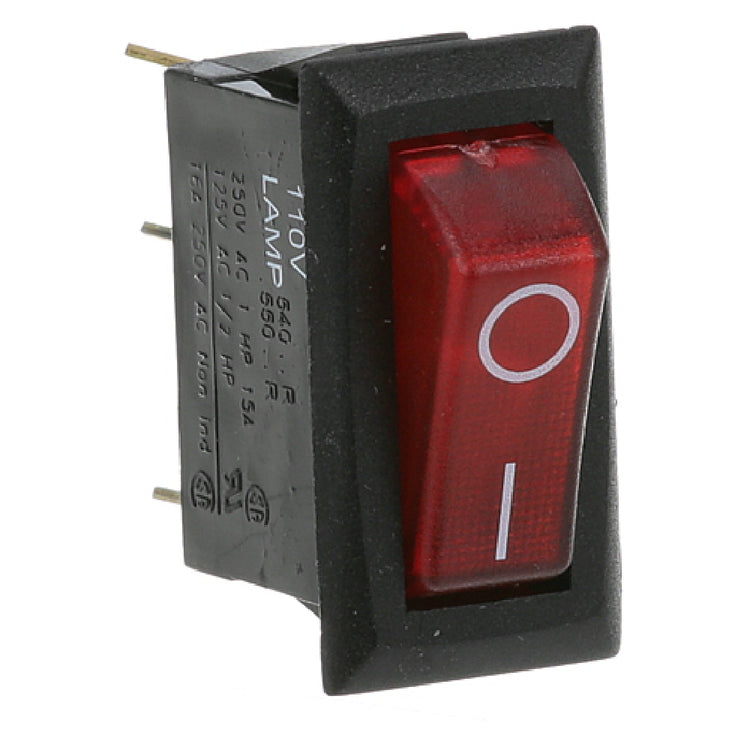 Newco 100085 [ Lighted Rocker ] [ Fits Hole 9/16" X 1-1/8" ], [ On/off ] [ Spst ] [ Terminals 3 (1/4" Tabs) ], [ Amp/volt 16a/250v 110v Lamp ], [ Color Lighted/red/black], [ Markings O I (circle & Dash) ]
