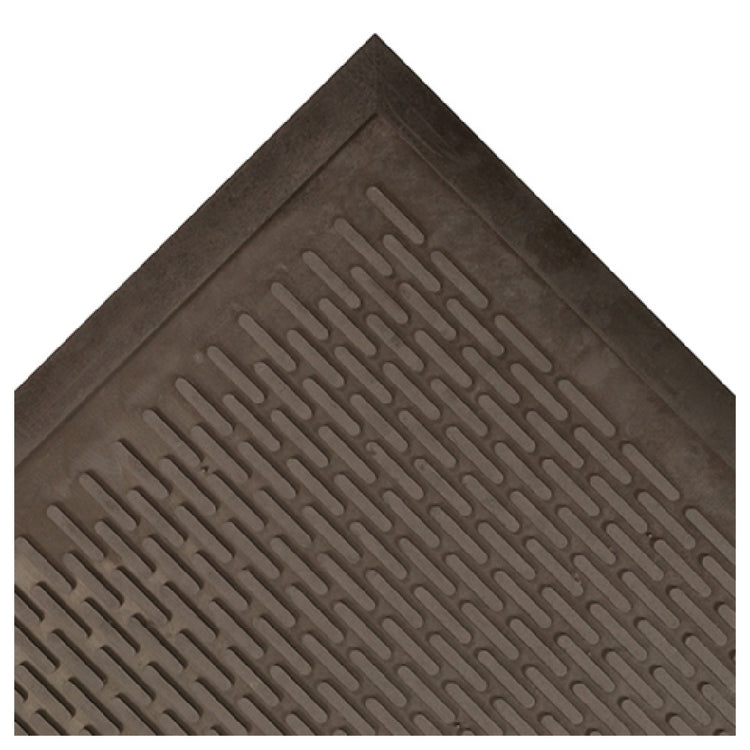 Notrax 340S0310BL 340 SOIL GUARD Entrance & C-Store Floor Mat is a meticulously designed solution for maintaining cleanliness and safety in high-traffic areas. Measuring 3ft x 10ft and with a thickness of 1/4", this entrance and convenience store floor mat is crafted from durable molded rubber, ensuring longevity and resilience against daily wear. The mat's raised edge is a critical feature, proficiently containing spills to prevent liquid messes from spreading to other areas, enhancing both cleanliness and safety. Furthermore, the slip-resistant surface provides added security by reducing the risk of slips and falls, making it an ideal choice for businesses that prioritize customer and employee safety. The mat is available in black, a color that complements a wide range of commercial interiors while camouflaging dirt and wear. This product is offered in small quantities, providing flexibility for businesses of varying sizes. Packaged conveniently in a boxed format, the Notrax 340 SOIL GUARD mat is a practical investment for any establishment seeking to uphold high standards of hygiene and safety.