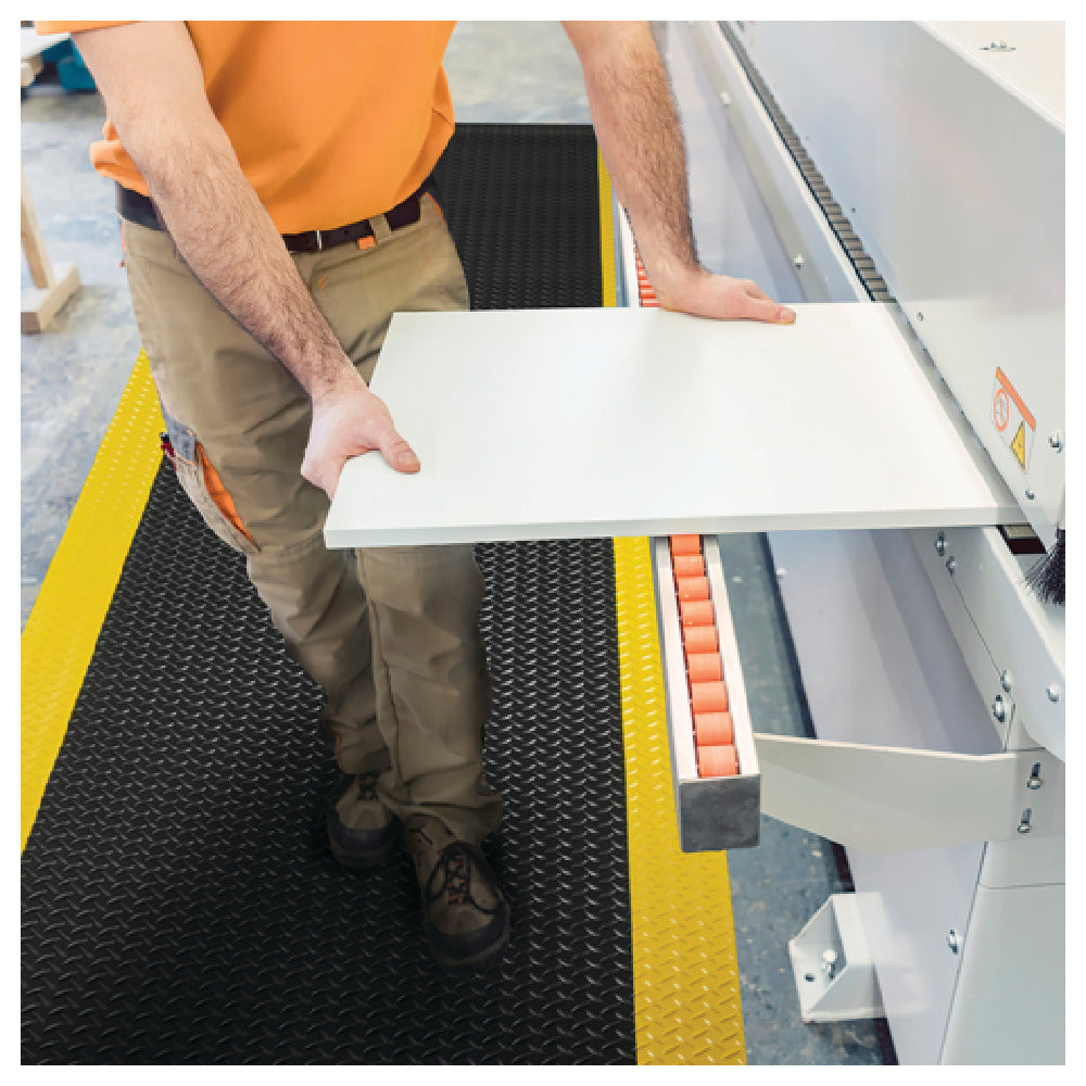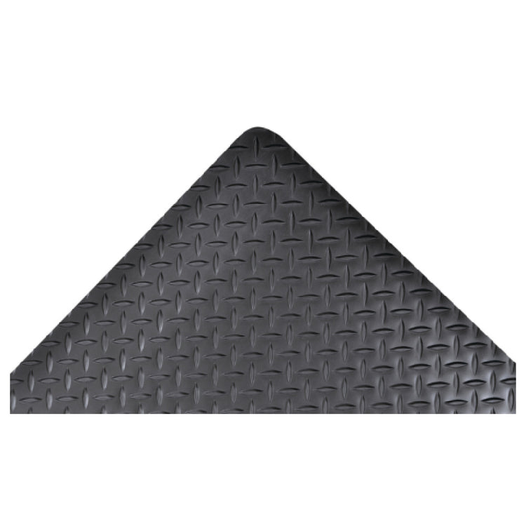 The Notrax 479S0035BL 479 Cushion Trax Mat is a high-performance industrial mat designed to provide maximum comfort and durability across various work environments. Measuring 3ft x 5ft with a substantial 9/16" thickness, this mat is engineered to withstand heavy-duty usage. Its surface features a robust vinyl top, renowned for its resilience under demanding conditions, while the diamond pattern enhances traction and safety by reducing slips and falls. Underneath this sturdy surface lies the Redstop closed cell foam base, which is specifically formulated to resist compression over time, ensuring sustained support and cushioning for users. Available in black, the Notrax 479 Cushion Trax Mat can be ordered in rolls and custom sizes to suit specific spatial requirements, adding an element of versatility to its design. Packaged in a convenient boxed format, this mat is ideal for industries ranging from manufacturing floors to commercial kitchens, where employees stand for prolonged periods. The unique combination of materials and design not only promotes comfort and safety but also contributes to a reduction in fatigue-related injuries, making it an indispensable asset for maintaining productivity and employee well-being in physically demanding settings.