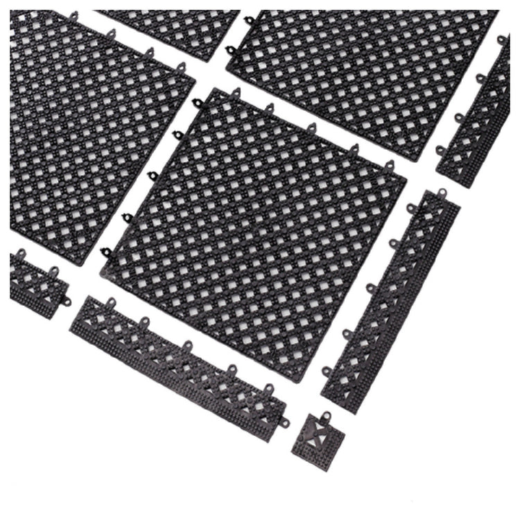 The Notrax 523K0022BL 523 Modular Lok-Tyle™ Corner is a versatile and essential component for flooring systems, designed specifically for T47 Plasti-Tile® interlocking tiles. With dimensions of 2 inches by 2 inches and a thickness of 1/2 inch, this black corner tile provides a seamless and secure fit, enhancing both the aesthetic and functional qualities of tiled surfaces. This product is NSF certified, ensuring compliance with rigorous health and safety standards, making it ideal for environments where hygiene is paramount, such as commercial kitchens, food processing areas, and laboratories. Its modular design allows for easy integration into existing flooring layouts, providing flexibility for diverse applications across various industries. The Notrax 523K0022BL corner tile is engineered to withstand demanding conditions, offering durability and stability to high-traffic areas. Its interlocking mechanism simplifies installation, reducing downtime and labor costs, which is beneficial for businesses seeking efficient flooring solutions. This corner tile is a practical choice for facilities requiring adaptable and resilient flooring systems that meet stringent safety and cleanliness standards.