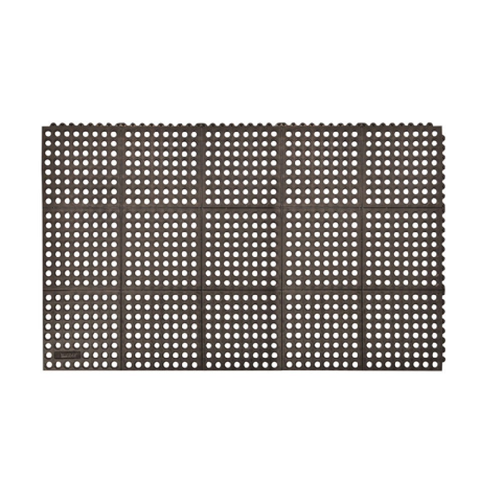 The Notrax 550S0035BL T56 Ultra Mat Max® is a 3-foot by 5,3/4-inch thick heavy-duty anti-fatigue mat system designed to provide exceptional comfort and safety in demanding environments. This mat features molded-in mat connectors, enabling seamless integration and custom configurations to suit various industrial applications. Its anti-slip surface enhances stability, making it ideal for workspaces where safety is paramount. The multi-nib backing ensures the mat stays securely in place, reducing the risk of slips and falls. Engineered with large hole drainage, it effectively manages liquids and debris, maintaining a clean and dry surface. Constructed from grease-resistant rubber, this mat is resilient against oil and chemical exposure, making it suitable for use in kitchens, workshops, and manufacturing facilities. Available in a sleek black color, the Notrax 550S0035BL offers both functionality and aesthetic appeal. Its robust design makes it an excellent choice for industries where prolonged standing is common, providing workers with comfort and reducing fatigue. This heavy-duty mat system is a reliable solution for enhancing workplace safety and comfort across various sectors.