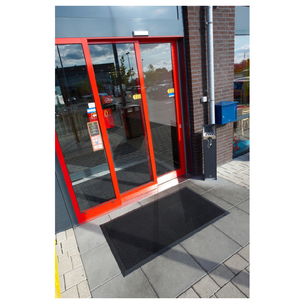 The Notrax 599S0035BL 599 Oct-O-Flex™ Entrance Floor Mat is a high-performance solution designed to enhance safety and cleanliness in outdoor high traffic areas. Measuring 3' x 5', this mat is constructed from durable SBR rubber, providing a heavy-duty, weatherproof option that withstands various environmental conditions. The mat features a multi-hole drainage system, effectively preventing water accumulation and promoting a non-slip surface. At a thickness of 1/2", it is engineered to offer superior durability and comfort underfoot. The beveled edge sides of this mat are a key feature, ensuring easy maneuverability for carts and wheelchairs, thereby increasing accessibility and convenience in commercial and public spaces. Its classic black color complements various settings, while its boxed packaging ensures the product reaches you in excellent condition. The Notrax 599 Oct-O-Flex™ Entrance Floor Mat is an optimal choice for businesses and facilities seeking a reliable matting solution that combines functionality with ease of maintenance, particularly in environments subjected to heavy foot traffic and challenging weather conditions. Its practical design and resilient material make it an indispensable asset in maintaining safety and cleanliness at entry points across various industry sectors.