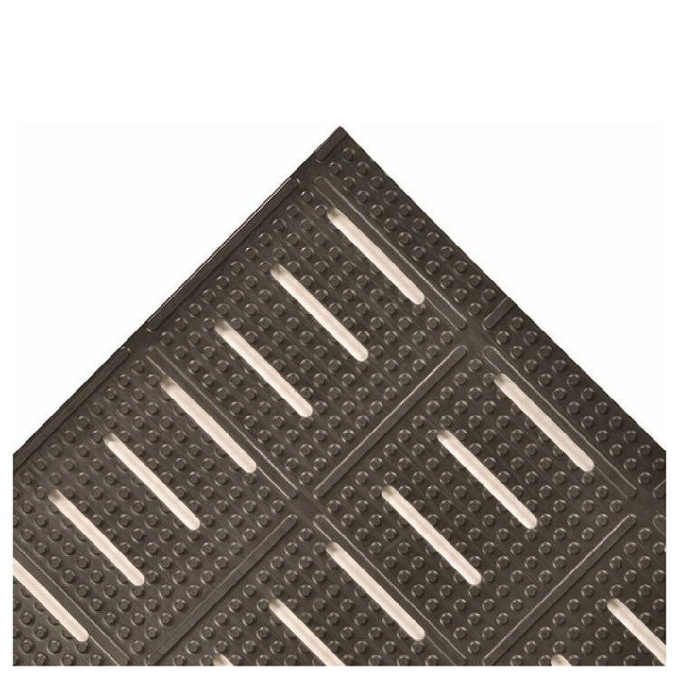 The Notrax 755R0024BL 755 Niru® Versa Runner® is a meticulously engineered mat designed to meet various industrial needs with its comprehensive features. Measuring 2 feet by 60 feet and with a 3/8-inch thickness, this mat is crafted to provide an ideal low-profile solution for environments requiring extensive coverage. Its intelligent design includes drainage slots that efficiently manage spills, ensuring a safer and cleaner surface. The mat is grease-proof, making it a perfect choice for areas exposed to oil and grease, such as kitchens and workshops. Furthermore, it incorporates anti-fatigue properties that enhance comfort and reduce strain for users who stand for extended periods, significantly benefiting employees in high-traffic environments. Slip-resistant, this mat ensures a secure footing, minimizing the risk of accidents. Enriched with MicroStop™ technology, its anti-microbial rubber composition actively inhibits the growth of bacteria and fungi, promoting a healthier work environment. Available in a sleek black color, the Notrax 755 Niru® Versa Runner® is proudly manufactured in the USA, reflecting superior craftsmanship and quality. This product is a versatile and essential component for businesses seeking durability, safety, and hygiene in their operational spaces, catering to segments such as food service, manufacturing, and institutional facilities.